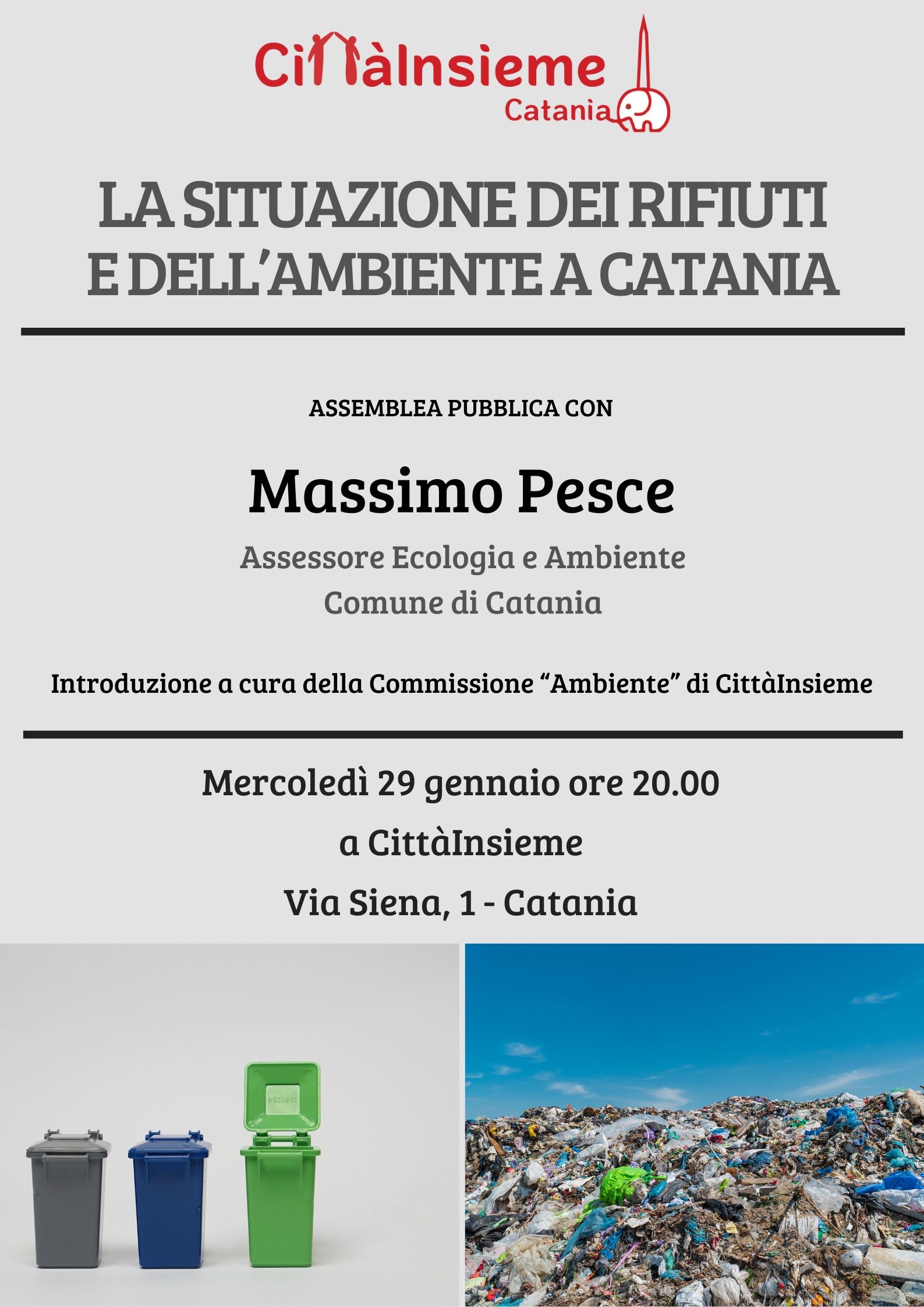 Ad un anno e mezzo dall’insediamento dell’Amministrazione comunale, prende il via un ciclo di appuntamenti tematici nei quali approfondiremo, punto per punto, tutti i problemi e le urgenze, mettendo sul tavolo le nostre proposte e quelle dei cittadini che desidereranno partecipare, coinvolgendo di volta in volta gli Assessori al ramo. Il primo appuntamento è dedicato alla situazione dei rifiuti e dell’ambiente.