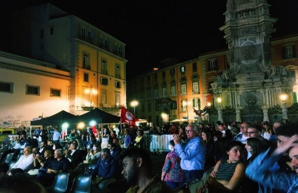 Mentre in platea ci sono i militanti di Potere al Popolo con le loro bandiere ma anche tanti volti noti, più o meno giovani, del mondo dell’associazionismo e della sinistra napoletana, insieme ai candidati delle altre due liste che sostengono la Clemente: “Alessandra Clemente Sindaco” e “Napoli 20.30”.