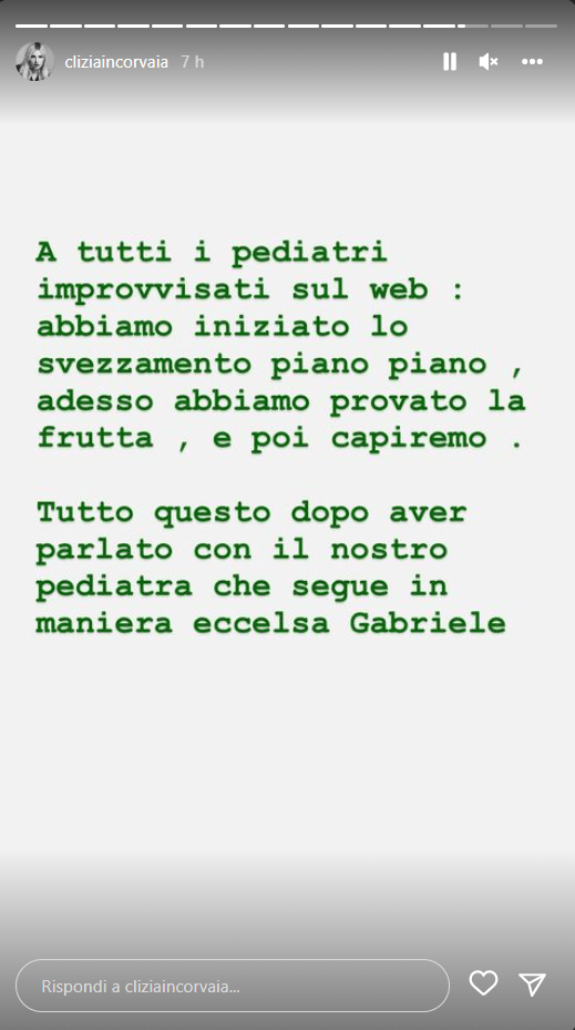 “A tutti i pediatri improvvisati sul web: abbiamo iniziato lo svezzamento piano piano, adesso abbiamo provato la frutta, e poi capiremo. Tutto questo dopo aver parlato con il nostro pediatra che segue in maniera eccelsa Gabriele”.
