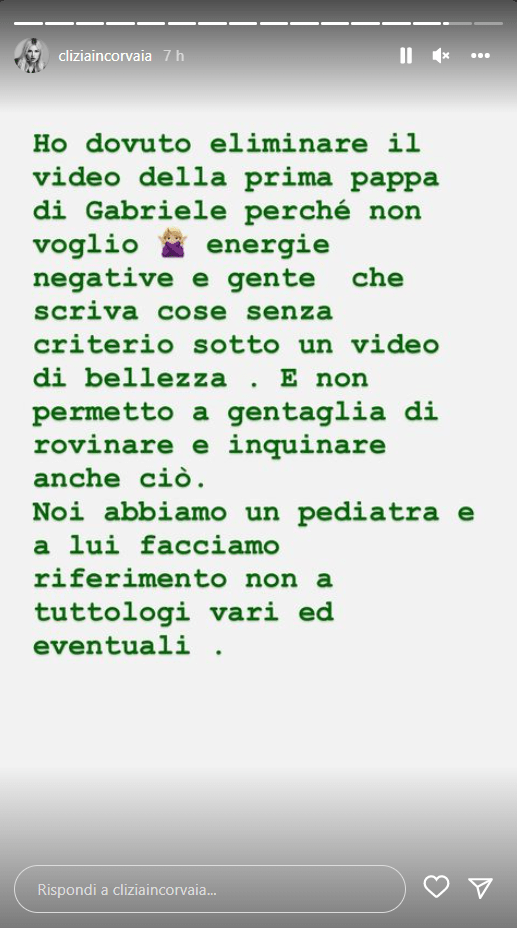 “Ho dovuto eliminare il video della prima pappa di Gabriele per non voglio energie negative e gente che scriva cosa senza criterio sotto un video di bellezza – ha aggiunto nelle stories su Instagram – E non permetto a gentaglia di rovinare e inquinare anche ciò. Noi abbiamo un pediatra e a lui facciamo riferimento non a tuttologi vari ed eventuali”.