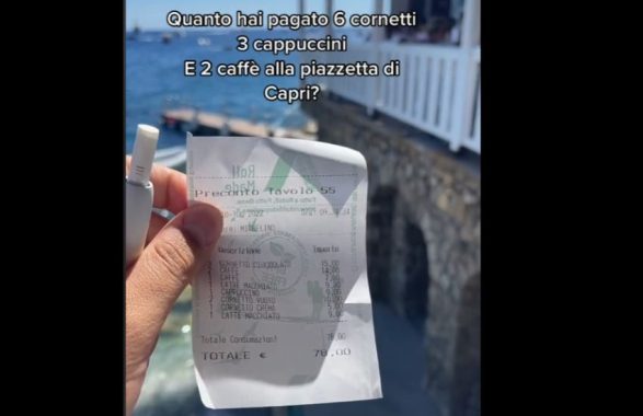 Nel video, postato su TikTok e che ha fatto il giro del web in poche ore, il ragazzo racconta la sua “disavventura”: “Ecco la colazione di stamattina che abbiamo fatto alla piazzetta di Capri”, ponendo in evidenza lo scontrino dove campeggiava il conto finale di 78 euro. Dopo ha poi girato la telecamera verso le amiche che hanno reagito con un sorriso un po’ imbarazzato.