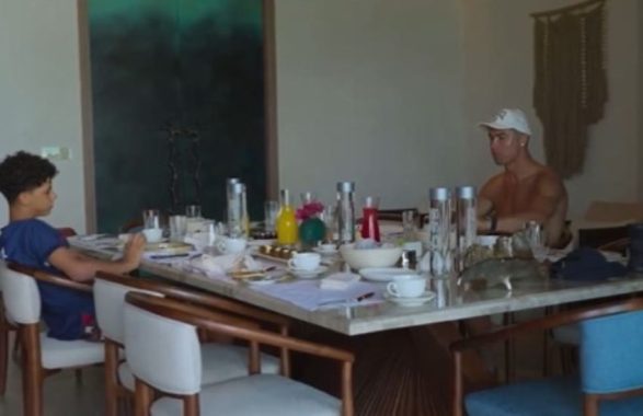 A quel punto Cristiano Ronaldo gli offre la ricetta perfetta per risvegliarsi e ricaricare le pile: un’ora di pesi e un’ora di tappeto. Questo è il suo allenamento tipico mattutino e invita il figlio ad unirsi a lui per combattere sonno e stanchezza. Nel video si vedono i due che si allenano nella palestra privata della casa del portoghese, prima alla lat machine per i dorsali e poi alla chest press per i pettorali.