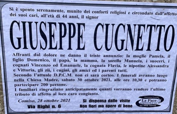 Si terranno sabato 30 ottobre i funerali di Giuseppe Cugnetto, il giovane deceduto a causa di un’emorragia celebrale a soli 44 anni. Secondo l’attuale D.P.C.M. non ci sarò corteo e i funerali avranno luogo presso la Chiesa Madre, alle ore 10:30.