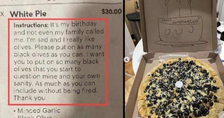 La storia di un ragazzo statunitense, di cui però non è stato rivelato il nome, è presto diventata virale sui social dopo che lui stessa l’ha condivisa. Sull’ordine della pizza il ragazzo ha scritto: “Oggi è il mio compleanno e nemmeno la mia famiglia mi ha chiamato. Sono molto triste e, allo stesso tempo, adoro le olive, quindi, volevo chiedere se fosse possibile aggiungere alla mia pizza, quante più olive nere possibili. Vorrei che ne metteste così tante da dubitare sulla mia e sulla vostra sanità mentale. Ovviamente, tutte quelle che potete senza rischiare di essere licenziati. Grazie”.