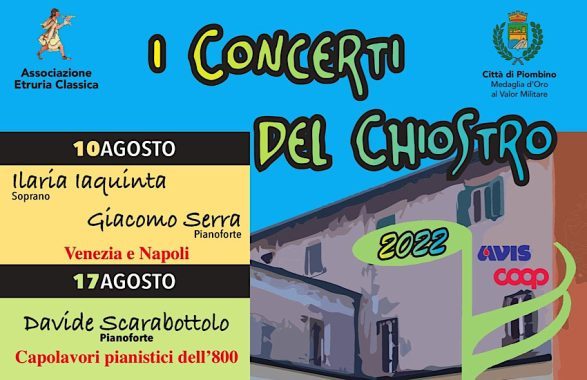 Torna a Piombino la rassegna concertistica “I Concerti al Chiostro si Sant’Antimo” organizzati, grazie al sostegno del Comune di Piombino, da Etruria Classica in collaborazione con l’associazione Avis Piombino: quattro appuntamenti, da mercoledì 10 a mercoledì 31 agosto, dedicati alla musica e per tutte le età.