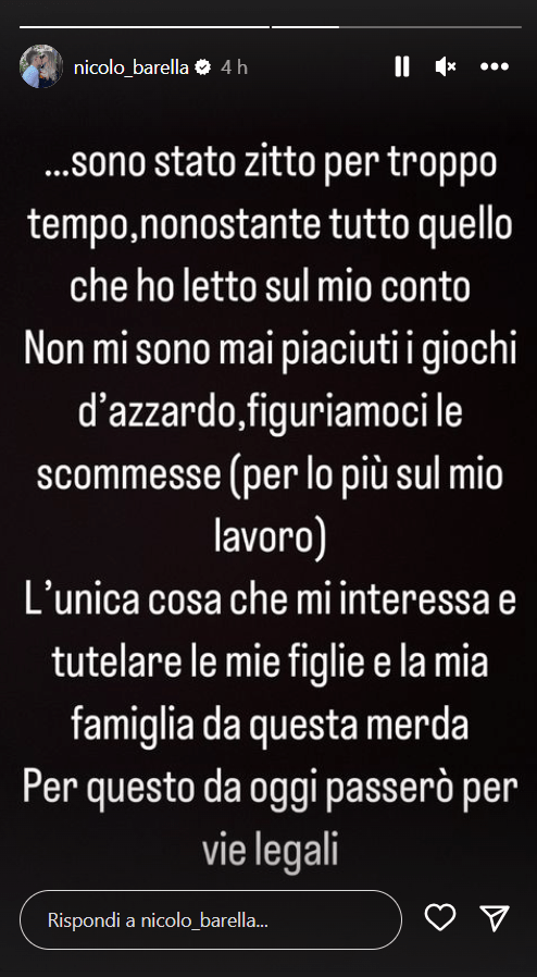 “Sono stato zitto per troppo tempo, nonostante tutto quello che ho letto sul mio conto. Non mi sono mai piaciuti i giochi d’azzardo, figuriamoci le scommesse (per di più sul mio lavoro). L’unica cosa che mi interessa è tutelare le mie figlie e la mia famiglia da questa m… Per questo da oggi passerò per vie legali”.