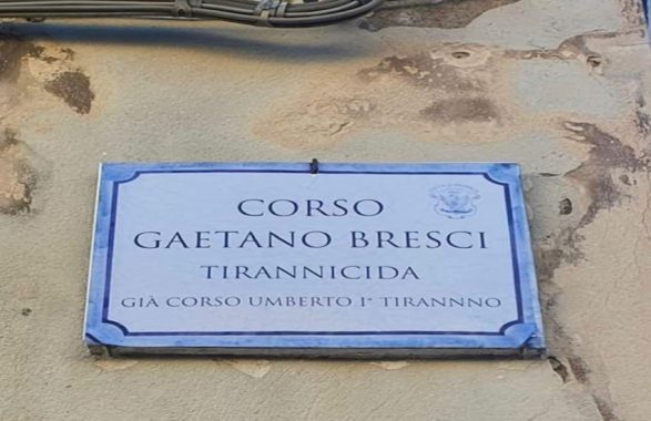 L’uomo, in sostanza, aveva precedentemente realizzato dei pannelli adesivi identici alle tabelle collocate lungo il Corso Umberto, sia nella grandezza che nella conformazione. Durante la notte li aveva collocati sulla toponomastica della principale arteria cittadina; anziché Corso Umberto, era stato scritto “Corso Gaetano Bresci, tirannicida. Già Corso Umberto I Tiranno” (Bresci fu un anarchico italiano, esecutore del regicidio del Re d’Italia Umberto I).