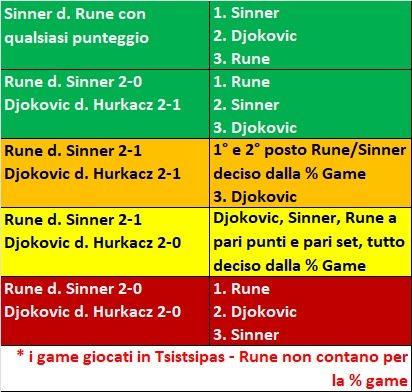 Potrebbe alla fine risultare decisiva anche la % game, parametro che entrerà in gioco nei casi previsti nella fascia arancione e in quella gialla e che vede al momento la seguente situazione: Sinner 56,89%, Djokovic 49,31%, Rune 45,71%. Come si può facilmente notare il tennista scandinavo si è si riposato ieri, ma risulta nettamente penalizzato dal fatto che la partita vinta per abbandono di Tsitsipas non contribuisca a questa statistica.