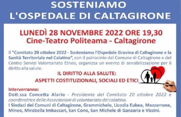 Si comunica che in data 20 ottobre 2022, è stato costituito il comitato “20 Ottobre 2022. SOSTENIAMO L’OSPEDALE GRAVINA DI CALTAGIRONE E LA SANITA’ TERRITORIALE NEL CALATINO” con lo scopo di promuovere iniziative a sostegno dell’Ospedale Gravina di Caltagirone e dell’Assistenza Sanitaria Territoriale nei Comuni del Distretto Sanitario di Caltagirone.