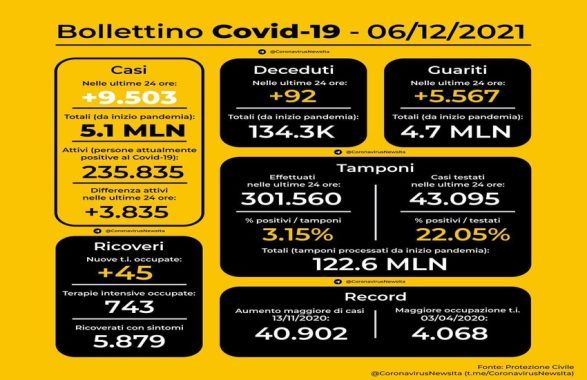 Covid in Italia 9.503 nuovi casi con 301.560 tamponi e 92 morti