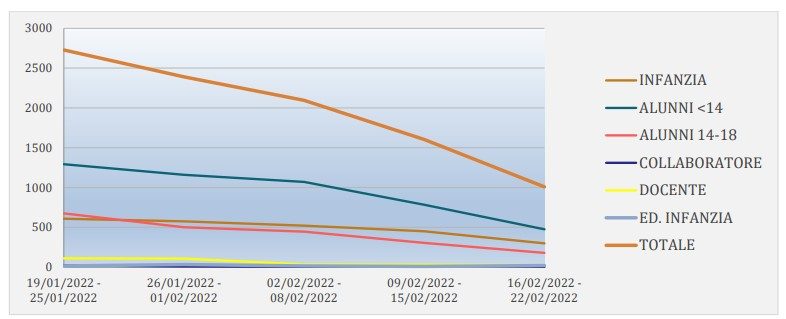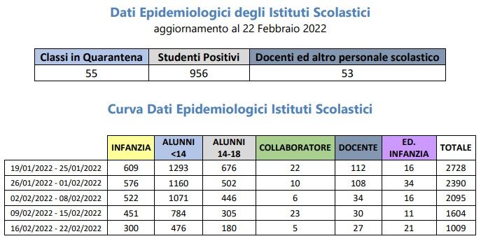 I dati di questa settimana sono decisamente confortanti, se paragonati a quelli della scorsa oppure a quelli di quella precedente. Anzitutto per quanto concerne il numero di classi in quarantena (ricordiamo che si parla di tutte le scuole, pubbliche e private, di ogni ordine e grado) passate da 97, nella settimana dal 9 al 15 febbraio, ad appena 55 in quella dal 16 al 22 febbraio. Una calo drastico, andato di pari passo con la diminuzione, in provincia ma anche nel resto del paese, del numero dei contagi.
