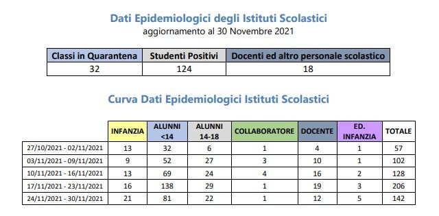 Nel resoconto della settimana dal 24 al 30 novembre, vediamo come le classi attualmente in quarantena siano 32, mentre la settimana scorsa erano 53. Gli studenti positivi sono attualmente 124, una diminuzione evidente rispetto ai 183 segnalati nella settimana dal 17 al 23 novembre. Diminuisce anche il numero dei positivi tra il personale scolastico non studentesco, che passa da 23 a 18 unità.