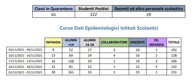 I dati, diffusi dalla Asl e relativi alla settimana dal primo al 7 dicembre, vengono segnalate 61 classi in quarantena. la settimana precedente erano la metà, 32.
