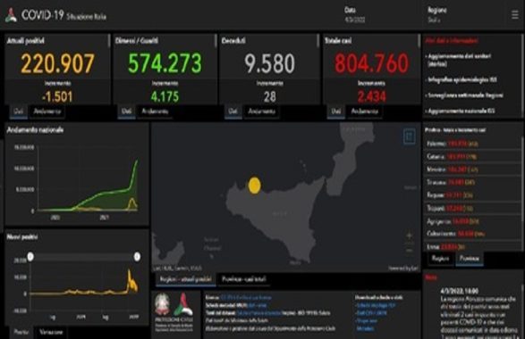 Attualmente i positivi sono 220.907 con una diminuzione di 1.501 casi, mentre i ricoverati sono 1.034 dei quali 67 in terapia intensiva.