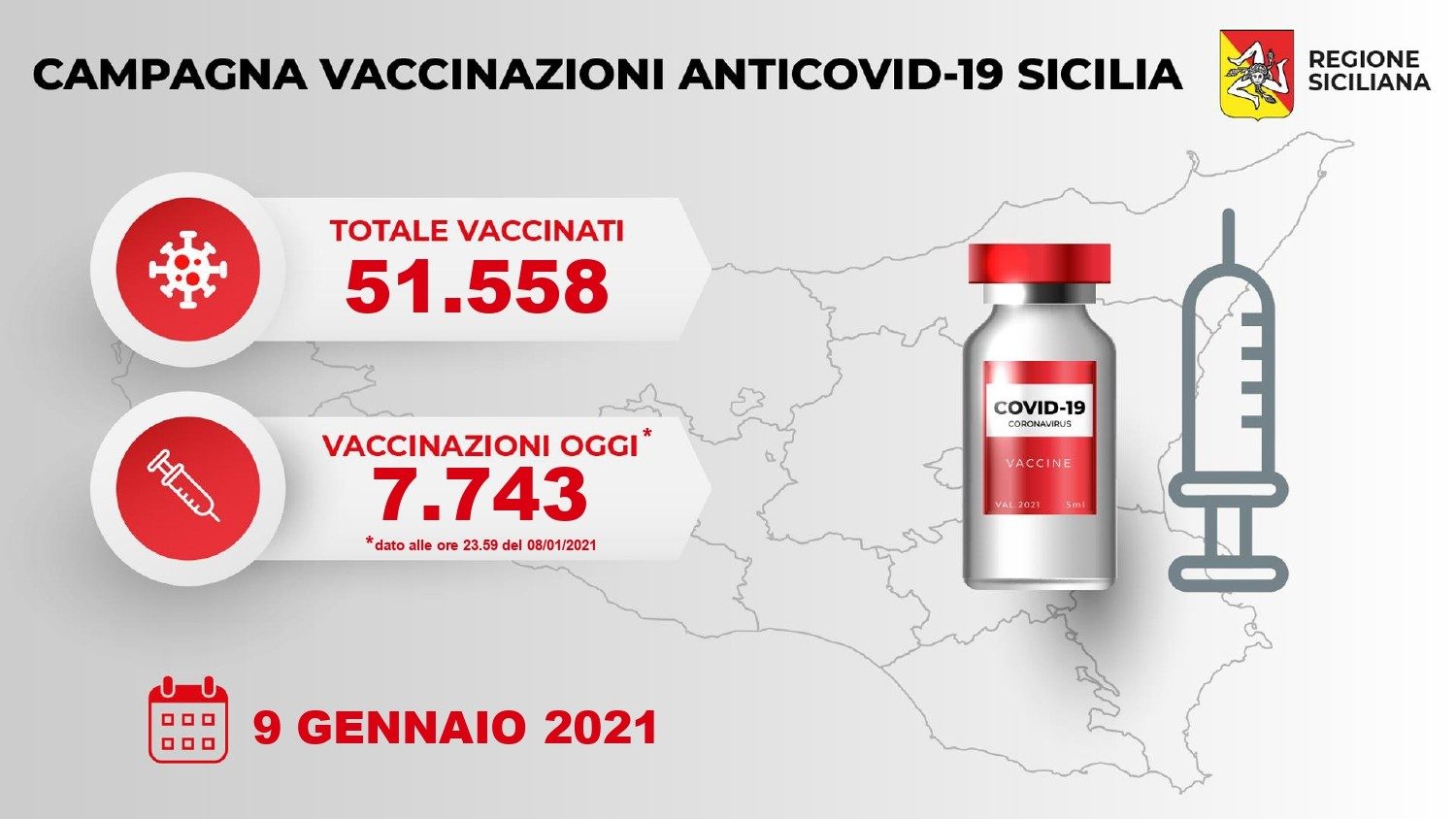 Sono stati in totale 7.743 i vaccini anticovid somministrati ieri, 8 gennaio, su altrettanti soggetti rientranti nel target previsto dal piano nazionale. Salgono così a 51.558 le persone che in Sicilia sono state sottoposte a vaccino dall’avvio della campagna vaccinale (dato estratto dalla piattaforma nazionale e in aggiornamento). Lo comunica la Regione Siciliana.