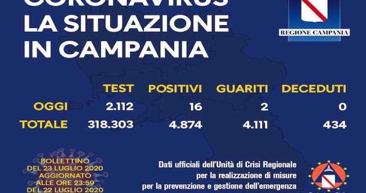 Sono 16 i nuovi casi di positivi al Coronavirus in Campania su 2.112 tamponi esaminati nelle ultime 24 ore. Rispetto a ieri un leggero calo: erano stati 19 i nuovi contagiati. Sono questi i dati diffusi nell’ultimo bollettino dell’Unità di Crisi della Protezione Civile. Nessun decesso.