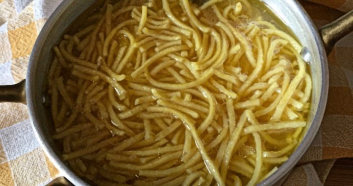 - Ingredienti per 6 persone: un chilo di carne di pecora tagliato dalla coscia o da altra parte magra; 3 litri d’acqua; una costola di sedano; un mazzetto di finocchietto selvatico; 4 etti di tagliolini all’uovo; 4-5 etti di formaggio pecorino dolce con 4 o 5 giorni di stagionatura.