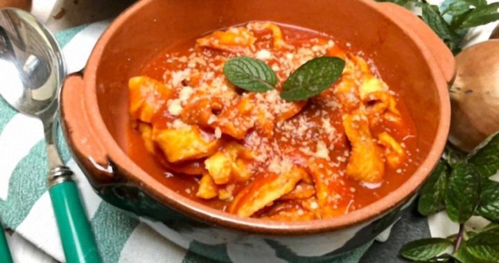 Procurarsi un chilo di trippa, lavarla accuratamente e metterla a cuocere in abbondante acqua convenientemente salata, a cui si aggiunge un gambo di sedano. Preparare intanto un buon sugo di pomodoro piuttosto liquido con olio, cipolla, sale e un pizzico di zafferano, tutto a crudo. Dopo un’ora, se la trippa è diventata tenera, estrarla dall’acqua e tagliarla a listelli sottili due centimetri e lunghi dieci. In una pentola possibilmente di coccio, metterla nella salsa di pomodoro, aggiungerci le foglie di menta e lasciar cuocere a fuoco medio e a recipiente scoperto per circa un’ora. È facoltativa l’aggiunta di pecorino secco grattugiato, perciò è consigliabile servirlo a parte in modo che ognuno possa cospargerlo sulla propria porzione a seconda del proprio gusto. Buon appetito da Nonna Itala.