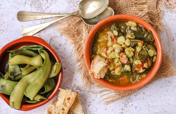 Ingredienti per la “Zuppa di fave e lardo” (6 porzioni): 500 grammi di fave secche; mezzo chilo di polpa di maiale conciata; 250 grammi di lardo salato; 2 o 3 cipolle; un cavolo cappuccio o una verza di circa 600 grammi; 4 patate di media grandezza; mezzo cucchiaino di sale da aggiungere a fine cottura; acqua.