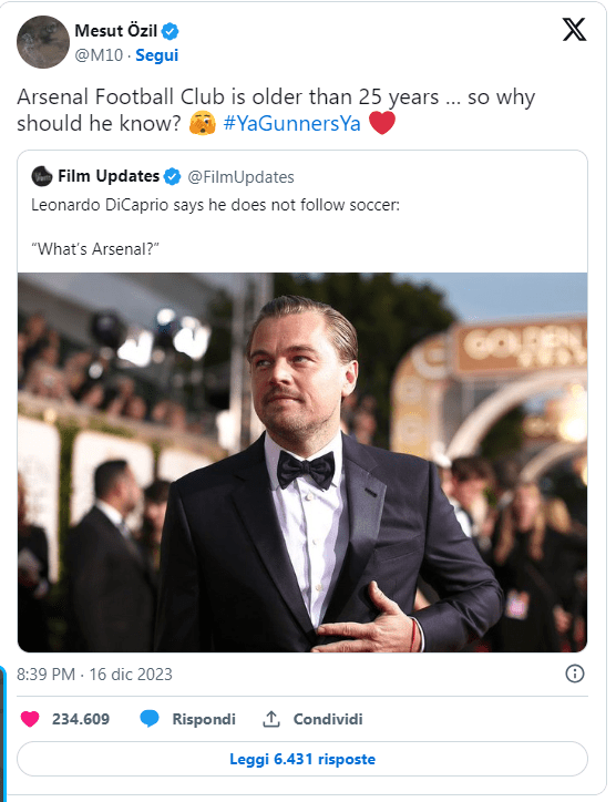 Così, su X è apparsa la notizia in cui Leonardo DiCaprio si domandava “cos’è l’Arsenal?“, Ozil non ha resistito e ha replicato prontamente una risposta che è diventata subito dopo virale.