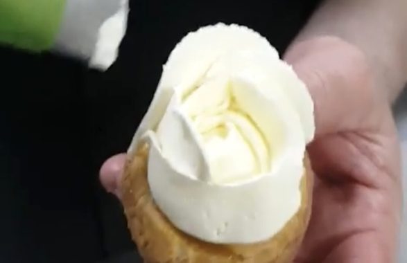 In sostanza si tratta di un bignè farcito, con all’interno una sostanza cremosa ai frutti esotici fusa con del “mango spadellato”. Il dolce viene reso meno secco e ancora più saporito grazie all’aggiunta di una “rosa” alla crema di mascarpone montato sull’estremità superiore.
