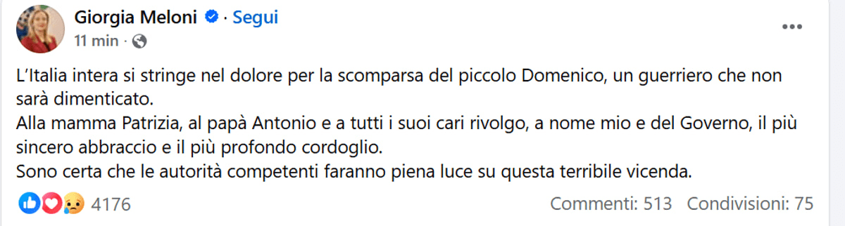 La premier ha ricordato il piccolo Domenico come “un guerriero che non sarà dimenticato”, esprimendo a nome suo e dell’esecutivo “il più sincero abbraccio e il più profondo cordoglio”. Meloni ha inoltre assicurato che le autorità competenti faranno piena luce su quanto accaduto, ribadendo la necessità di chiarire ogni aspetto della vicenda.