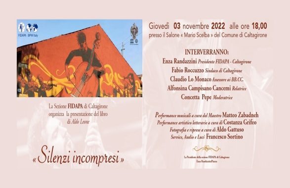 Su iniziativa della sezione Fidapa di Caltagirone con il patrocinio del Comune, giovedì 3 novembre, alle 18, nel salone di rappresentanza “Mario Scelba” del municipio, si terrà la presentazione del libro di Aldo Leone “Silenzi incompresi”.