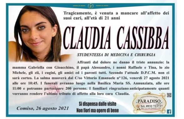Si svolgeranno domani 27 agosto, a Comiso, i funerali di Claudia Cassibba, la 21enne studentessa di Medicina e Chirurgia, deceduta ieri nel terribile incidente stradale avvenuto alle porte di Enna. Nelle scontro sono rimaste ferite altre 9 persone.