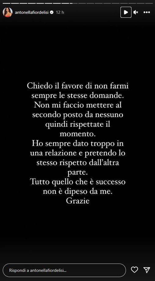 Ecco le sue parole: “Non mi faccio mettere al secondo posto da nessuno quindi rispettate il mio momento. Ho sempre dato troppo in una relazione e pretendo lo stesso rispetto dall’altra parte. Tutto quello che è successo non è dipeso da me”.