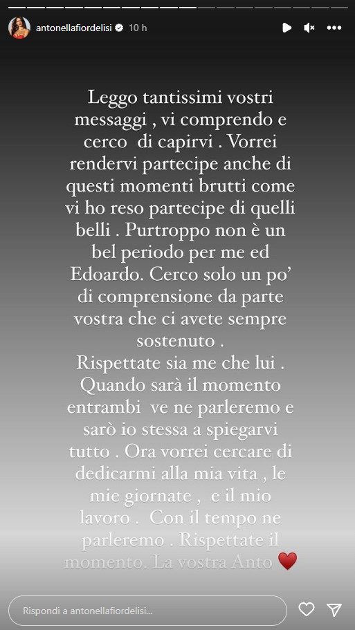 Dopo questo preambolo arriva la conferma di una crisi in atto: “Purtroppo non è un bel periodo per me e Edoardo. Cerco solo un po’ di comprensione da parte vostra che ci avete sempre sostenuto. Rispettate sia me che lui”.