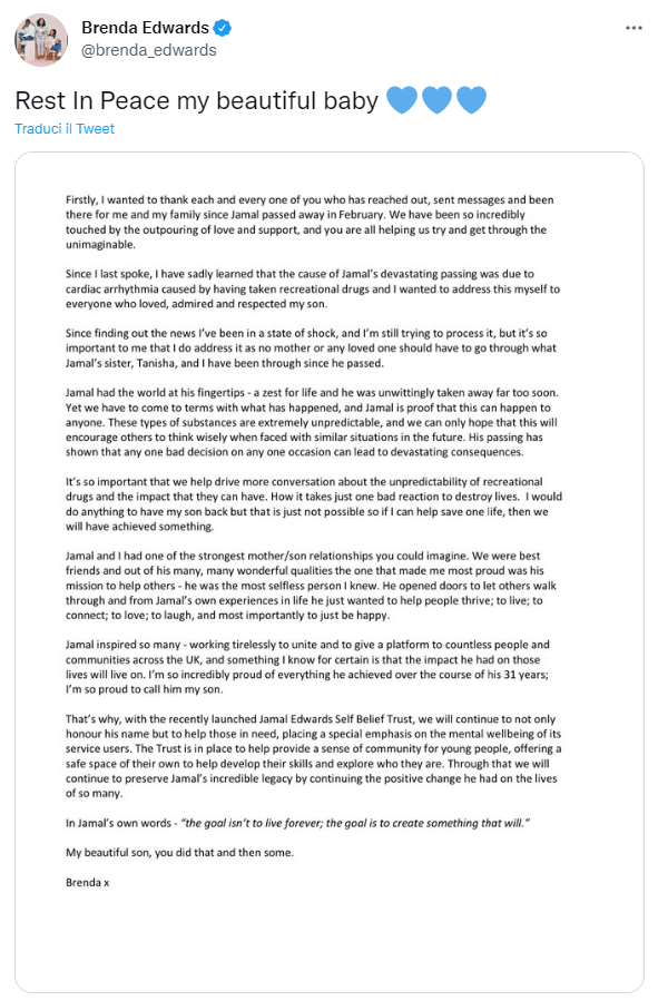 In linea con tale missione, Brenda ha anche annunciato il lancio del Jamal Edwards Self Belief Trust, che secondo lei “aiuterà i bisognosi, ponendo un’enfasi speciale sul benessere mentale degli utenti del servizio”.