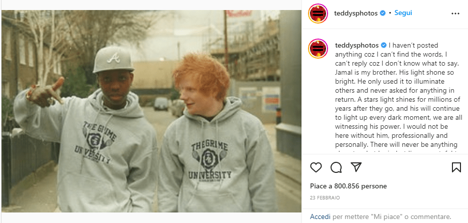 “Jamal è mio fratello. La sua luce brillava così brillante. L’ha usata solo per illuminare gli altri e non ha mai chiesto nulla in cambio. La luce di una stella risplende per milioni di anni dopo che se ne sono andate, e la sua volontà continuerà a illuminare ogni momento buio, stiamo tutti assistendo al suo potere”, ha scritto Sheeran su Instagram. “Non sarei qui senza di lui, professionalmente e personalmente. Non ci sarà mai niente di simile a quello che è, ma sono così grato di essere esistito nella sua orbita. Mio fratello, andiamo.”