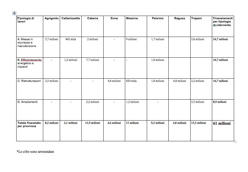 La maggiore disponibilità finanziaria, già acquisita, permette di finanziare ulteriori 39 progetti distribuiti in tutto il territorio regionale, precisamente: nove in provincia di Catania, otto nel Messinese, sei in provincia di Agrigento, sei a Palermo, cinque in provincia di Trapani, due a Enna e Caltanissetta e, infine, uno nel Ragusano. Si tratta di interventi di ristrutturazione (circa 16,7 milioni di euro), ammodernamento, messa in sicurezza e manutenzione degli edifici (circa 24,7 milioni di euro), ampliamenti e completamenti di strutture esistenti, con rimozione di barriere architettoniche, realizzazione di mense, palestre e laboratori scolastici (8,9 milioni), lavori per migliorare l’efficienza energetica e gli impianti degli istituti (10,7 milioni).