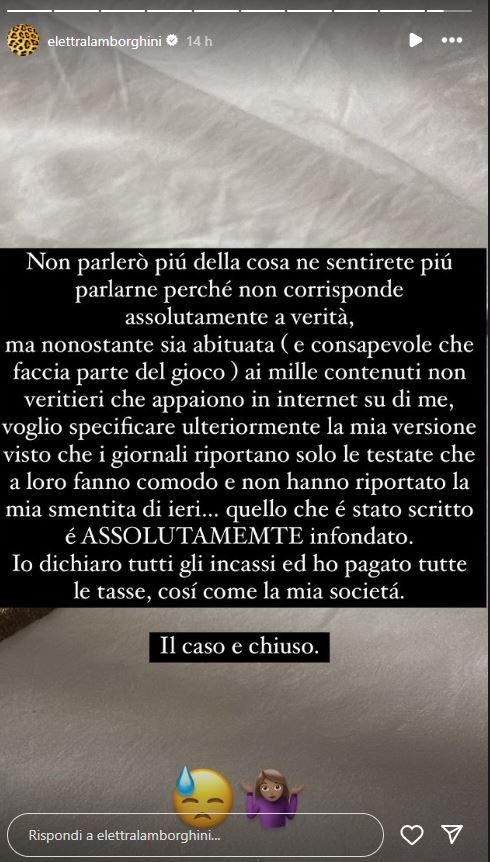 La sua smentita però non ha avuto la stesso eco mediatica della notizia diffusa dal Corriere di Bologna, quindi ha urlato di nuovo a voce alta la sua innocenza con un’altra Storia su Instagram. “Non parlerò più della cosa, né sentirete più parlarne perché non corrisponde assolutamente a verità” – ha esordito l’influencer su Instagram, sottolineando come la sua smentita su una presunta evasione fiscale non sia stata riportata dalle testate giornalistiche, a differenza della sua presunta evasione fiscale.