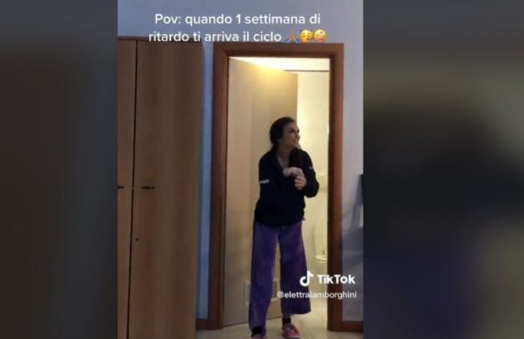 Il video, pubblicato su TikTok, ritrae la Lamborghini che esce festante dal bagno e che si lascia andare cantando addirittura una canzone della chiesa: “Ti ringrazio mio Signore non ho più paura…”, con la seguente didascalia: “Quando una settimana di ritardo ti arriva il ciclo”.