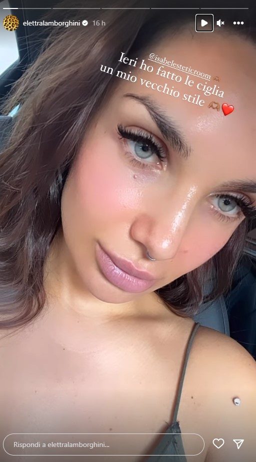 Da come è possibile “leggere” nelle Storie, Elettra Lamborghini si sta tirando davvero a lucido. Nella prima Storia mostra le sue “nuova” ciglia” con questa didascalia: “Ieri ho fatto le ciglia un mio vecchio stile”.