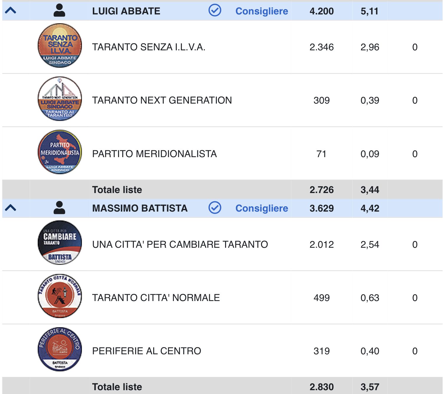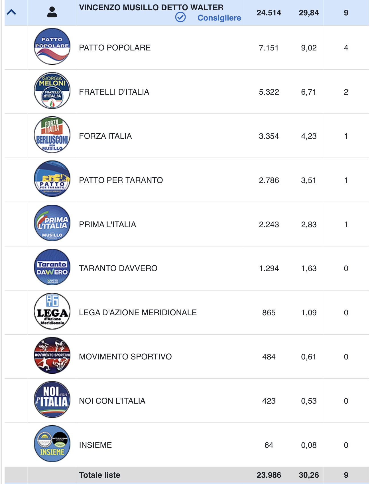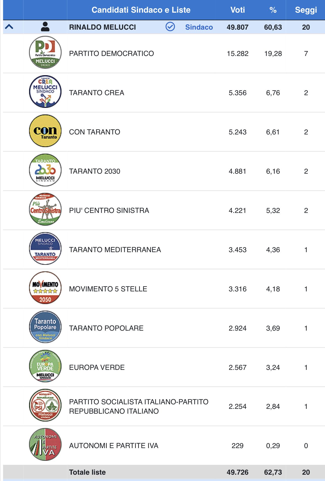 Quasi un plebiscito. Rinaldo Melucci si conferma sindaco di Taranto con il 60,63% e 49807 voti ottenuti, dato definitivo delle 191 sezioni scrutinate e chiuse alle 4.04 del mattino del martedì dopo una lunga notte di conteggi.