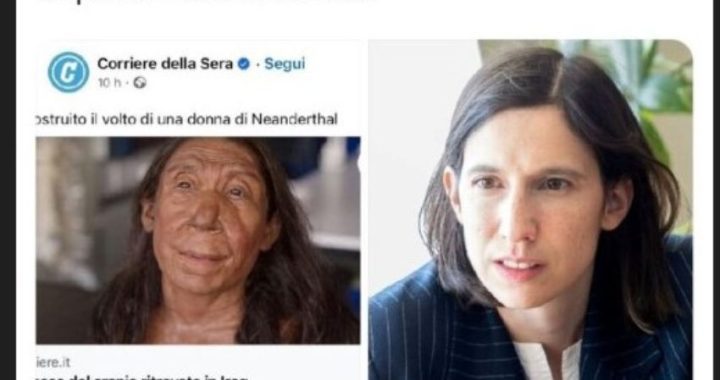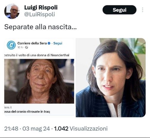 Pochi giorni fa circolò sui social la ricostruzione del volto della donna di Neanderthal in occasione del lancio di un documentario su Netflix. Dal profilo social di Luigi Rispoli è stato pubblicato il post della discordia, con i volti della Schlein e della donna di Neanderthal uno di fianco all’altro, foto accompagnata da questa scritta: “Separate alla nascita…“.
