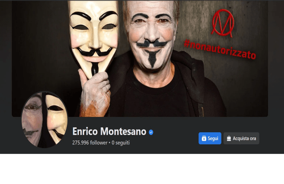 Ma le cose non stanno così, e crediamo sia il caso raccontare i fatti al meglio. Il profilo verificato di Enrico Montesano su Facebook è all’indirizzo facebook.com/enricomontesanoattore, se però quest’indirizzo lo visitiamo dall’Italia questo è quello che ci troviamo di fronte: