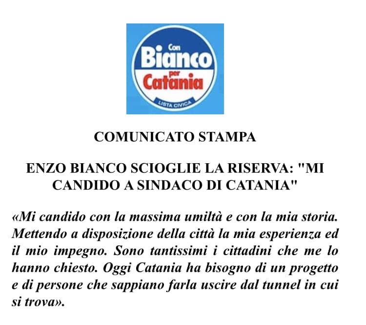 Lo ha annunciato con un comunicato dal suo profilo facebook dove scrive: “Mi candido con la massima umiltà e con la mia storia. Mettendo a disposizione della mia città la mia esperienza e il mio impegno. Me l’avete chiesto in tanti… Oggi Catania ha bisogno di un progetto e di persone che sappiano farla uscire dal tunnel in cui si trova. Occorre il supporto e l’aiuto di tutti ma, in maniera particolare, quello dei giovani. Non possiamo più perdere tempo, occorre intervenire in modo serio, rigoroso e competente. Mettiamoci al lavoro!”