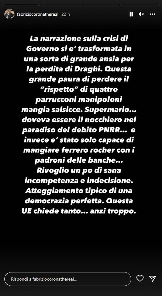 Fabrizio Corona, evidentemente per iniziare a prendere confidenza con le questioni politiche, in una sua Storia su Instagram ha avuto modo di parlare della crisi di Governo: “La narrazione sulla crisi di Governo si è trasformata in una sorta di grande ansia per la perdita di Draghi. Questa grande paura di perdere il rispetto di quattro parrucconi manipoloni mangia salsicce”.