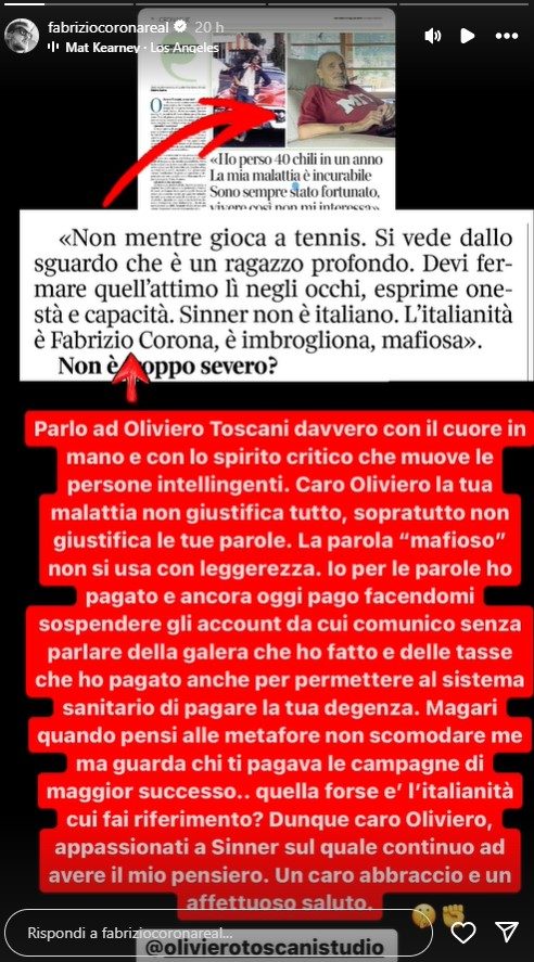 Poi è arrivata un’altra velenosa stoccata: “Magari quando pensi alle metafore non scomodare me ma guarda chi ti pagava le campagne di maggior successo… quella forse è l’italianità cui fai riferimento?”. In conclusione Corona ha invitato Toscani a continuare a seguire Sinner, ma senza tirare lui in ballo, per poi salutarlo con un caro abbraccio e un affettuoso saluto, sotto il quale sembra nascondersi una punta di malcelata ironia.