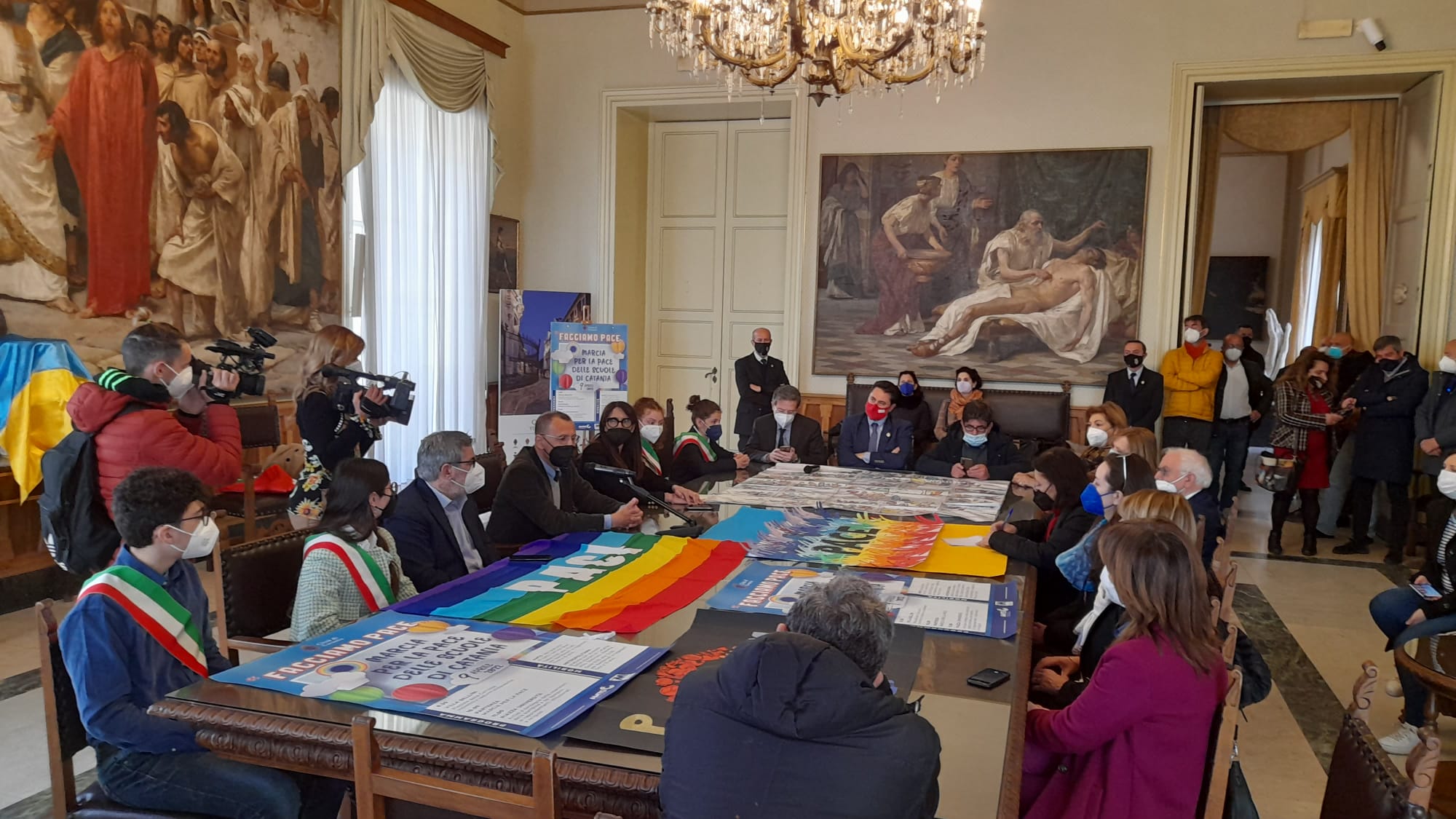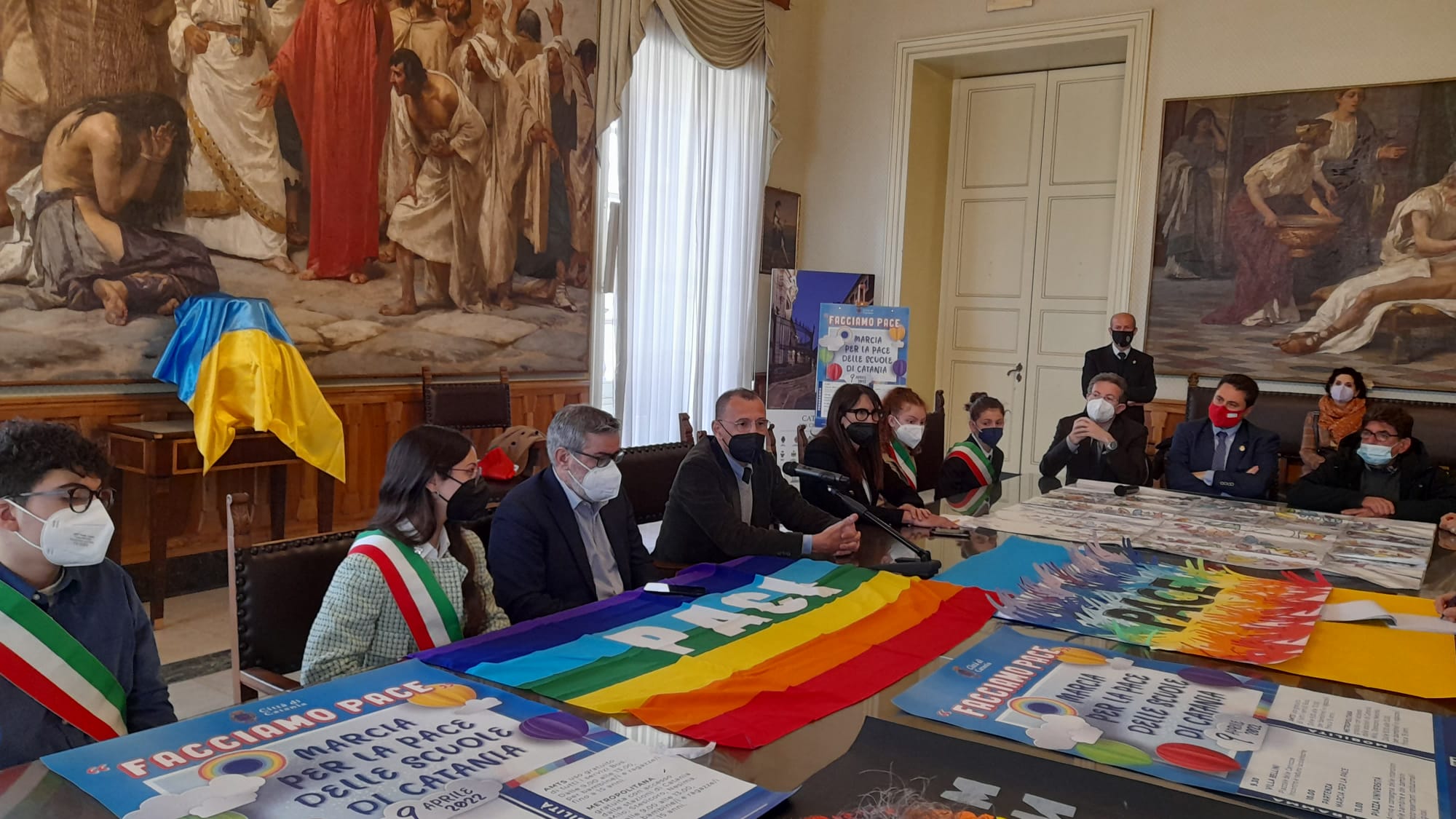 L’arcivescovo Luigi Renna ha inviato un saluto speciale con un messaggio video con il quale, confermando la propria presenza all’incontro di sabato in piazza Università, ha invitato tutti a vivere una giornata per la pace per esprimere la solidarietà ai popoli che vivono il dramma della guerra, in particolare il popolo ucraino, e per ritornare “a concetti come non violenza, disarmo, equilibrio che si costruisce non con la deterrenza delle armi ma con accordi che riconoscano l’autodeterminazione di ogni popolo“. Erano presenti in sala giunta anche il capo di Gabinetto Giuseppe Ferraro, il presidente della Commissione consiliare Scuola e Cultura, Giovanni Grasso, il presidente del II Municipio, Massimo Ruffino, che insieme con i responsabili delle altre circoscrizioni è stato parte attiva nell’organizzazione dell’iniziativa e di attività tematiche nelle scuole, e inoltre, dirigenti delle scuole catanesi, rappresentanti delle realtà associative impegnate nell’accoglienza a sostegno delle popolazioni vittime di guerra, rappresentanti di Amts e Fce MetroCt.