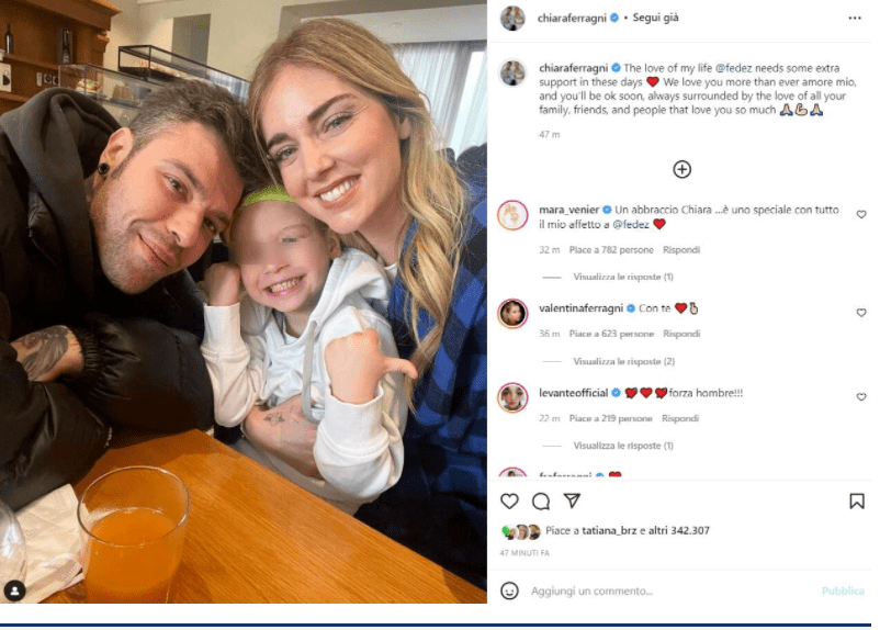 Arriva subito sempre tramite i social il messaggio di Chiara Ferragni a sostegno del marito. Oltre a Chiara in migliaia hanno voluto fare gli auguri alla coppia e a tutta la loro famiglia.