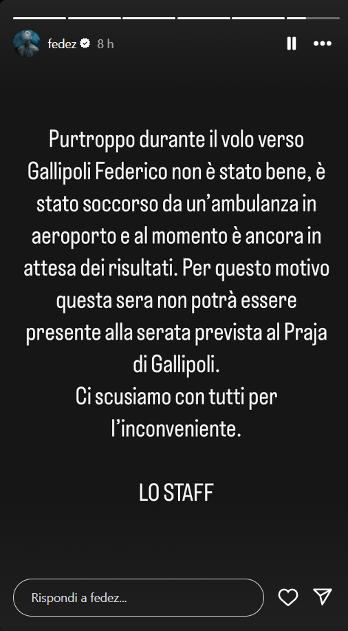“Purtroppo durante il volo verso Gallipoli, Federico non è stato bene, è stato soccorso da un’ambulanza in aeroporto e al momento è ancora in attesa dei risultati – si legge – Per questo motivo questa sera non potrà essere presente alla serata prevista al Praja di Gallipoli. Ci scusiamo con tutti per l’inconveniente”.
