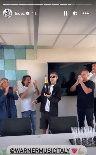 Il rapper posta un video in cui stappa una bottiglia con il team della Warner e scrive: “Grazie a Warner Music per avermi accolto nella loro grande famigli”.