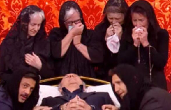 Lo scenario andato in scena nella seconda puntata di “Felicissima Sera – All Inclusive” è stato quanto immaginario tanto conturbante: cosa succederebbe se Gerry Scotti, uno dei più importanti conduttori Mediaset e della tv italiana, morisse da un giorno all’altro? Il duo comico ha provato a mettere in scena il suo funerale, condito da una veglia completa di fiori, salma, capezzale, lumini e donne pagate per prendere parte e cantare ai cortei funebri con grida e gesti di disperazione. Sempre nella puntata di ieri di “Felicissima Sera” si è poi visto il conduttore sdraiato sul letto con in mano un rosario. Tutto questo, ovviamente, unito a battute, in cui sono stati chiamati in causa anche Piero Chiambretti ed Enrico Papi. Pio e Amedeo, ormai, si sa, giocano e centrano la loro immagine sul filo sottile della polemica che vuole il politically correct messo un po’ in secondo piano, ma per tanti, nella serata di ieri, si è un po’ andati oltre ed il cattivo gusto è stato sfiorato più volte. Lo sketch è destinato a fare discutere, come hanno dimostrato i primi commenti di shock ed indignazione sul web.