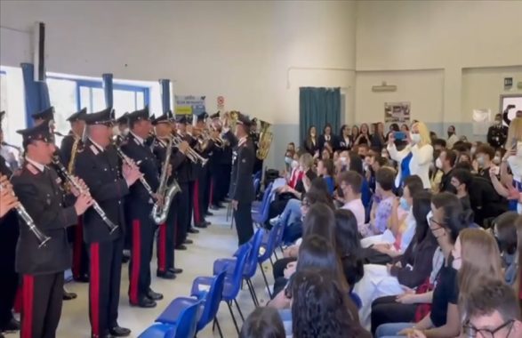 Gli studenti del liceo Elsa Morante di Scampia non hanno saputo contenere l’entusiasmo quando la Fanfara del 10° Reggimento Campania ha intonato lo spartito della celeberrima “O’ surdat nnammurat”, storica canzone napoletana scritta dal poeta Aniello Califano.