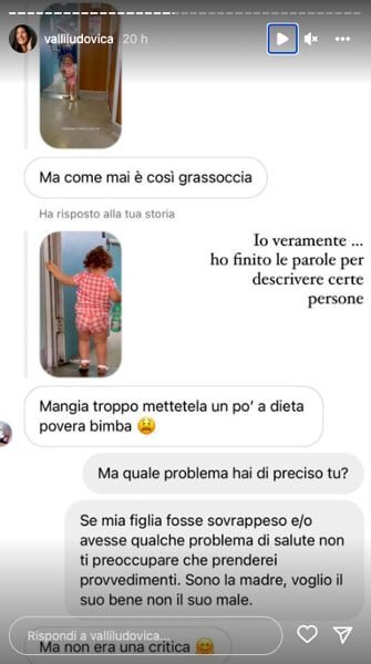 Una utente di Instagram che ha risposto a una storia pubblicata sul noto social network dalla Valli ha scritto: “Ma come è così grassoccia. Mangia troppo mettetela un po’ a dieta, povera bimba“. Il monito un po’ particolare che vuole invogliare a mettere a dieta una bimba di appena 15 mesi che corre felice è stato subito replicato dalla Valli, che ha risposto: “Ma quale problema hai di preciso tu? Se mia figlia fosse in sovrappeso e/o avesse qualche problema di salute non ti preoccupare che prenderei provvedimenti. Sono la madre, voglio il suo bene non il suo male“.