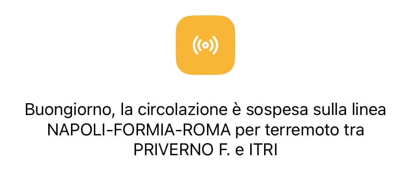 Anche i tanti pendolari sulla linea ferroviaria tra Roma e Napoli hanno subito forti disagi a causa del presunto terremoto. Quello che vedete è il messaggio apparso sull’app di Trenitalia che annuncia la sospensione del servizio in provincia di Latina.